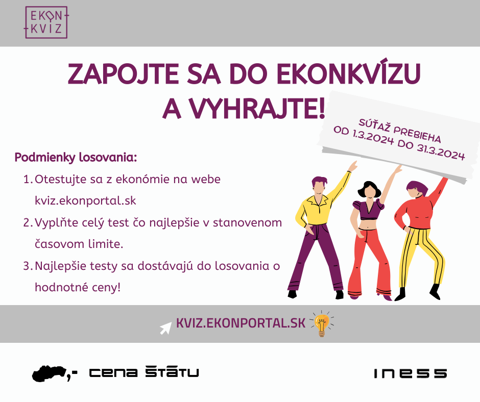 Už od piatka, 1. marca 2024 spúšťame nové súťažné kolo v Ekonkvíze, tentokrát pre verejnosť. Spomedzi najlepšie vyplnených testov v termíne od 1.3. – 31.3. 2024, budeme losovať 6 víťazov, ktorí od nás získajú hodnotné ceny. Podrobné pravidlá súťaže nájdete v sekcii "Pravidlá súťaže" na tomto webe.